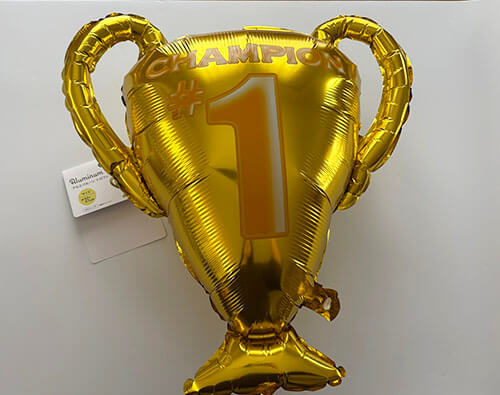 セリアではアルミバルーンのトロフィーが販売されています、パーティ・身内イベントなどで堅苦しくない表彰ならアルミバルーンは大きく目立ちつつ軽く写真映えもバッチリです