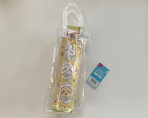 サイズは26cm × 11.5cm × 11.5cmの透明なビニール生地バッグです、購入した店舗ではラッピングコーナーで販売されていました