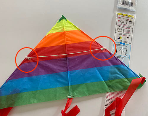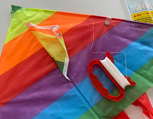 セリア レインボーカイトその後、タコ糸を指定場所に通して結んで固定すれば組み立て完了です